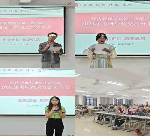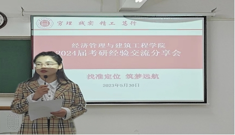 为明确学生考研规划,挖掘自身潜能,树立考研必胜的自信,营造浓厚考研氛围,学院特邀2023年考研成功上岸的四位学生为学院各专业学生做考研经验交流分享。5月30日晚在2教323教室召开了经济管理与建筑工程学院首届考研经验分享交流会,学院书记助理叶赵强,考研成功上岸学生21级物流管理专业李晴、经济学专业黄顺、人力资源管理专业张梦茹、电子商务专业裘功浩,以及学院大一、大二和大三有考研意向学生参加此次会议,会议由22级辅导员张雨停主持。