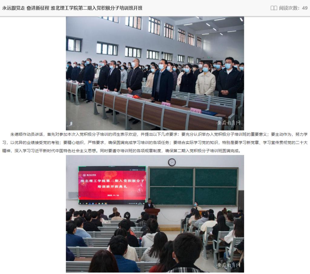 11月16日下午,tyc1286太阳成集团采用主会场与分会场相结合的方式举行第二期入党积极分子培训班开班仪式。出席本次开班仪式的有校党委书记、督导专员朱德顺,副院长郑来纪,各党总支、党支部书记,相关部门负责人及全体参训学员,校党委委员党建办主任付金沐主持开班仪式。安徽教育网对此进行了报道。